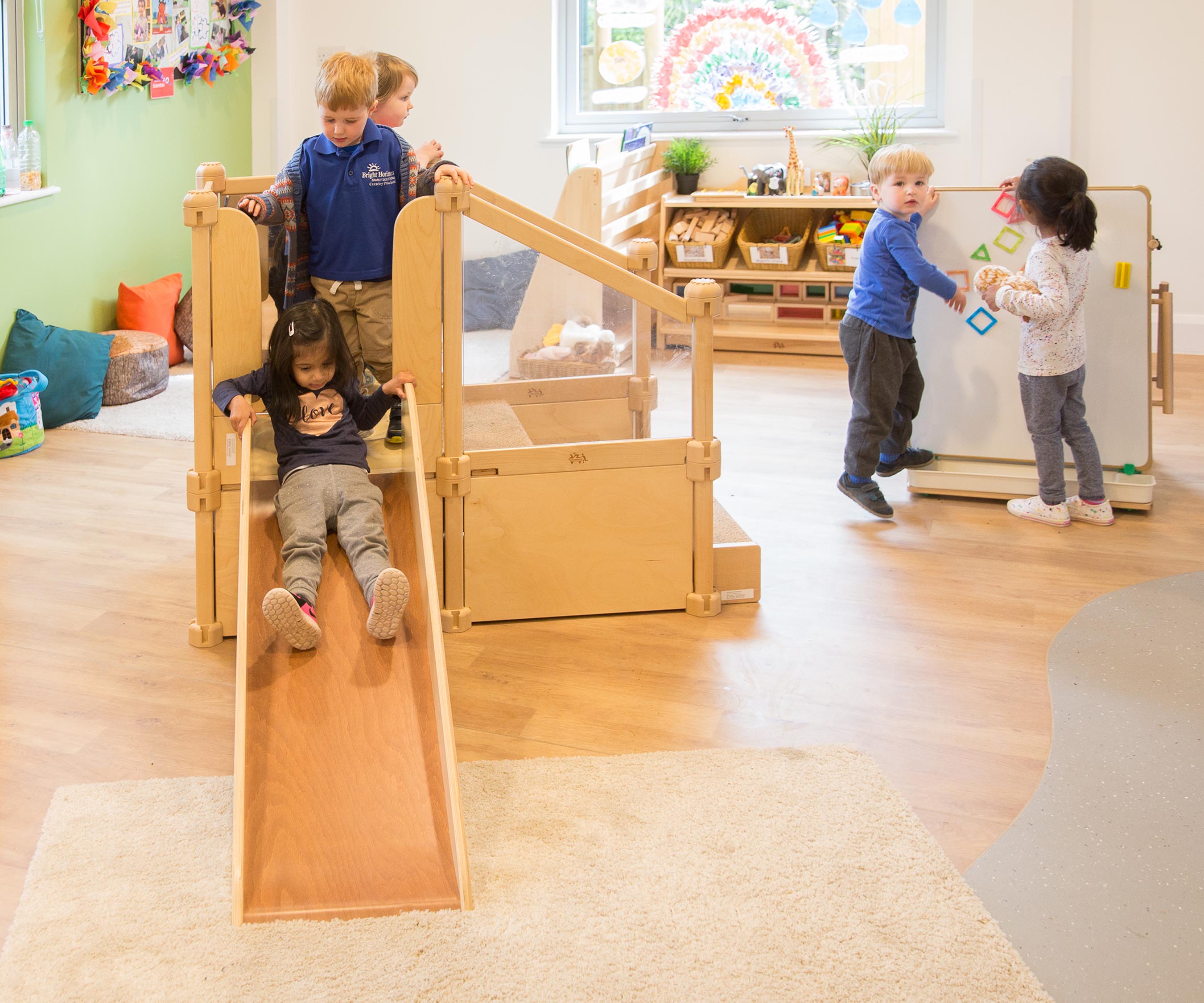 This set is perfect if your children are ready for the challenge and excitement of a slide. All our Nursery Gyms are assembled with modular parts and a tool-free connecting system, allowing you to reconfigure your set easily.