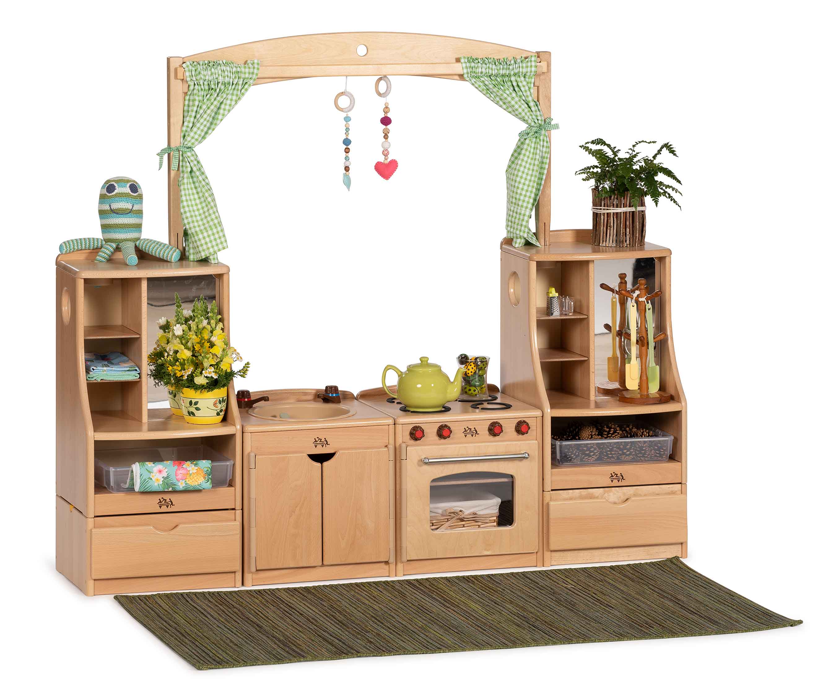 A cosy kitchen with a view. Little homemakers will feel contented as they bustle happily around their workplace. Items have bevelled holes on the side to allow easy lifting for teachers and great posting opportunities for toddlers! Stack them onto a Drawer to grow your unit for older children.