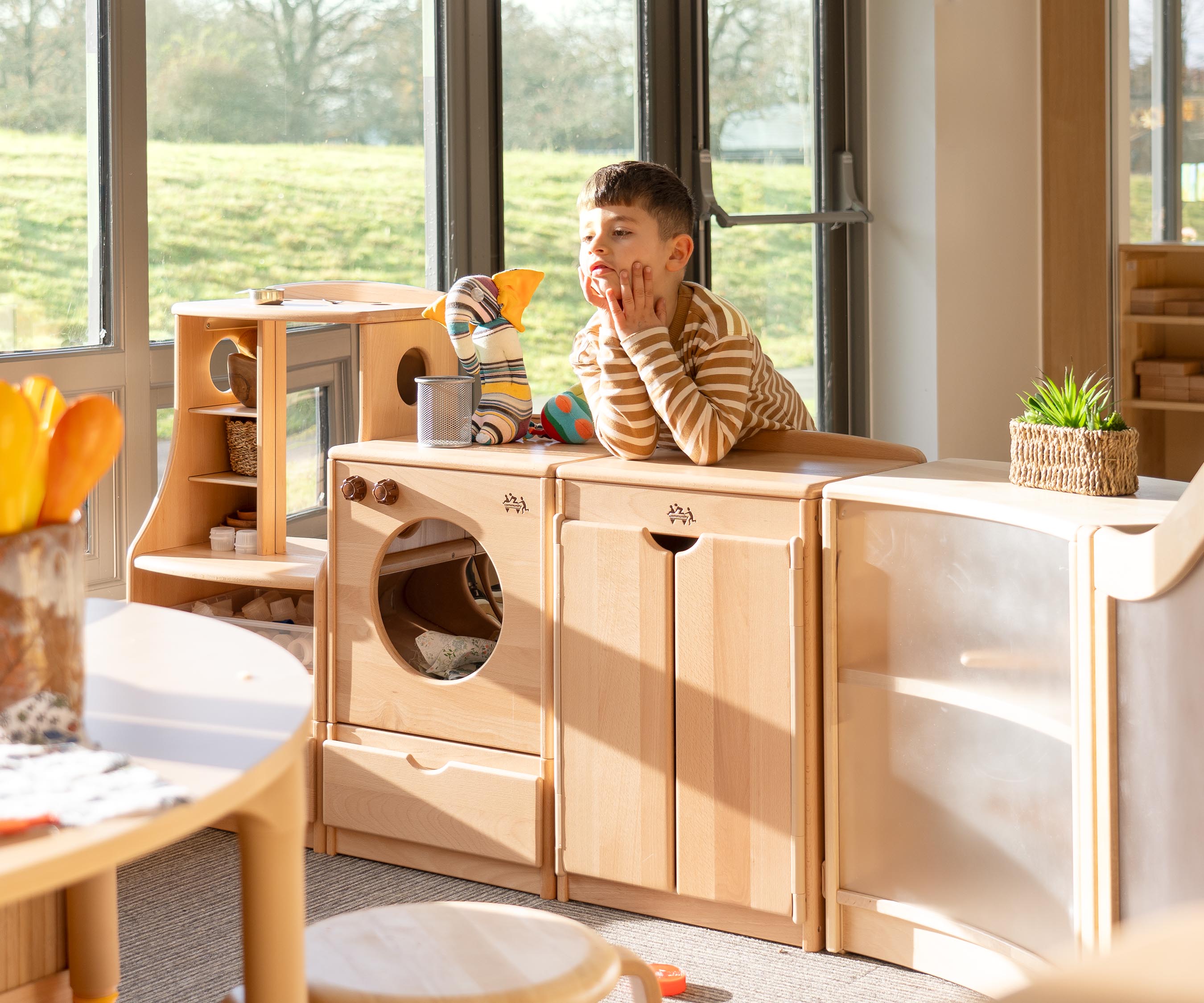 Toddlers love posting balls and clicking dials. The Washing Machine intrigues young explorers with its curved mirror drum. Add a Drawer to grow your unit for older children.